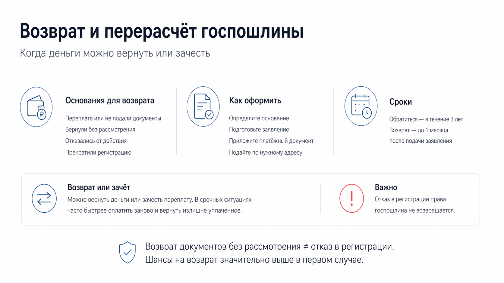Отдельно стоит запомнить неприятное правило: если в регистрации права отказано, госпошлина по общему правилу не возвращается. Этот момент часто упускают.