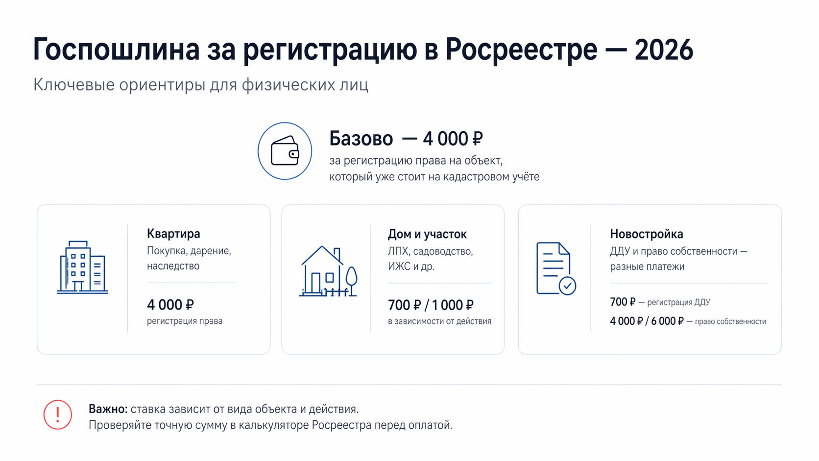 Для обычной регистрации права собственности на квартиру, дом, гараж или другой объект недвижимости, который уже стоит на кадастровом учете, гражданин в 2026 году чаще всего ориентируется на 4000 рублей, а не на старые 2000.Если одновременно идет кадастровый учет и регистрация прав на новый объект, ориентир уже 6000 рублей.