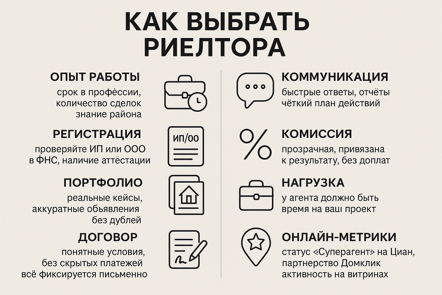 Проведите короткое интервью. Попросите ссылку на публичный профиль на Циан, Домклик, Яндекс Недвижимости, Авито, попросите пару свежих кейсов с цифрами. По профилю видно тон работы, стабильность публикаций, аккуратность карточек.