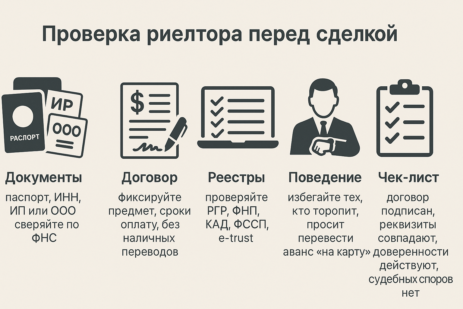 Честный специалист проходит аттестацию, подтверждает квалификацию через систему РГР. Карточка агента, статус компании видны в Едином реестре, данные сверяются по ФИО, названию агентства. Это быстрый способ отделить профессионала от случайного посредника.