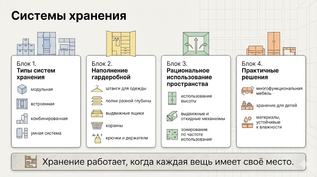 - Зонируйте по частоте использования: повседневное на уровне глаз, сезонное выше или ниже.