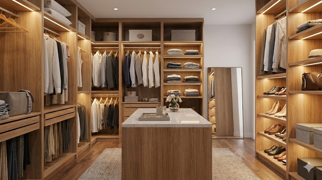 Выбор места — первый шаг. Гардеробную можно разместить в отдельной комнате, нише, под лестницей или даже преобразовать кладовку. Учитывайте удобство доступа из спальни или прихожей, чтобы сократить перемещения. Избегайте мест с высокой влажностью, таких как зоны рядом с ванной без гидроизоляции, и участков с резкими перепадами температуры, чтобы одежда не портилась. В 2026 году популярны решения, которые гармонично вписываются в интерьер, например, скрытые раздвижные двери или декоративные перегородки.